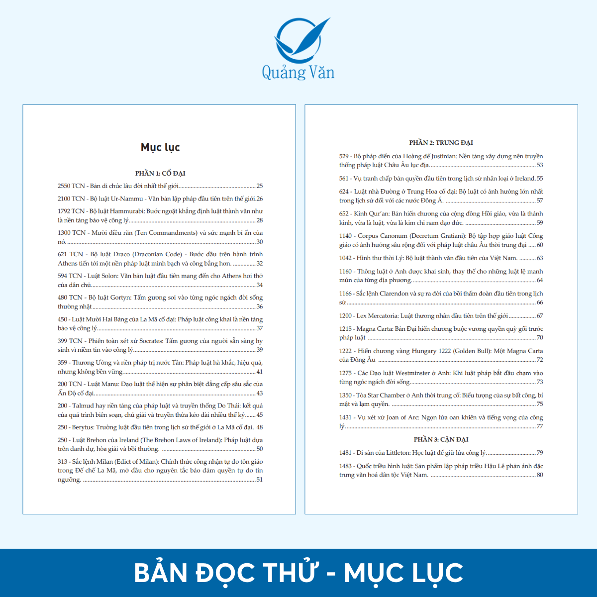 Cuốn sách này được biên soạn như một hành trình kể chuyện sống động về sự hình thành và phát triển của pháp luật qua hàng ngàn năm, từ những bộ quy tắc sơ khai thời cổ đại đến các hệ thống pháp lý phức tạp ngày nay. Sách được thiết kế không chỉ dành riêng cho sinh viên chuyên ngành luật, giảng viên, các chuyên gia pháp lý (luật sư, thẩm phán, công chứng viên) mà còn phù hợp với bất kỳ độc giả nào mong muốn tìm hiểu về trật tự xã hội và lịch sử văn minh nhân loại một cách sâu sắc. Tuy nhiên, cuốn sách này không dừng lại ở việc liệt kê các sự kiện khô khan mà hướng tới việc giải mã “tại sao” và “như thế nào” pháp luật lại định hình cuộc sống con người. Khi đã thấu hiểu được gốc rễ lịch sử của các quy định pháp luật, độc giả có thể thoát khỏi tư duy áp dụng luật một cách máy móc để cảm nhận được giá trị thực sự trong từng điều khoản. Ngoài ra, việc nắm bắt được bức tranh toàn cảnh về sự đấu tranh cho công lý, bình đẳng và nhân quyền trong quá khứ sẽ là nền tảng quan trọng giúp người học luật hiện đại hình thành bản lĩnh nghề nghiệp và tư duy phản biện sắc bén. Bên cạnh đó, việc hiểu rõ bối cảnh ra đời của các bộ luật cũng giúp chúng ta trân trọng hơn những quyền con người hiện hành và có cái nhìn thấu đáo hơn trước các xung đột pháp lý đương đại.