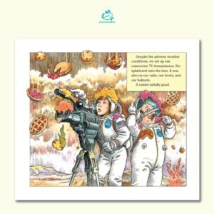 Năm 2013, sau 35 năm kể từ khi tập đầu tiên trong series “Trời nhiều mây và có thể có thịt viên” ra đời, tác giả Judi Barrett đã đưa độc giả đến thăm “Hành tinh bánh nướng”. Vẫn tiếp tục kết cấu “truyện lồng trong truyện”, lần này người ông đã nằm mơ trở thành một phi hành gia và đi đến sao Hỏa. Tại đây, ông đã gặp người sao Hỏa và biết được những rắc rối của họ. Hàng ngày họ phải đối mặt với những cơn mưa bánh nướng, không biết phải làm gì để xử lí vấn đề nan giải này. Thật may, đoàn phi hành gia từ Trái Đất đã tìm ra một giải pháp tuyệt vời. Vậy giải pháp đó là gì nhỉ? Các bé hãy khám phá khi đọc cuốn sách tranh “Hành tinh bánh nướng” nhé!